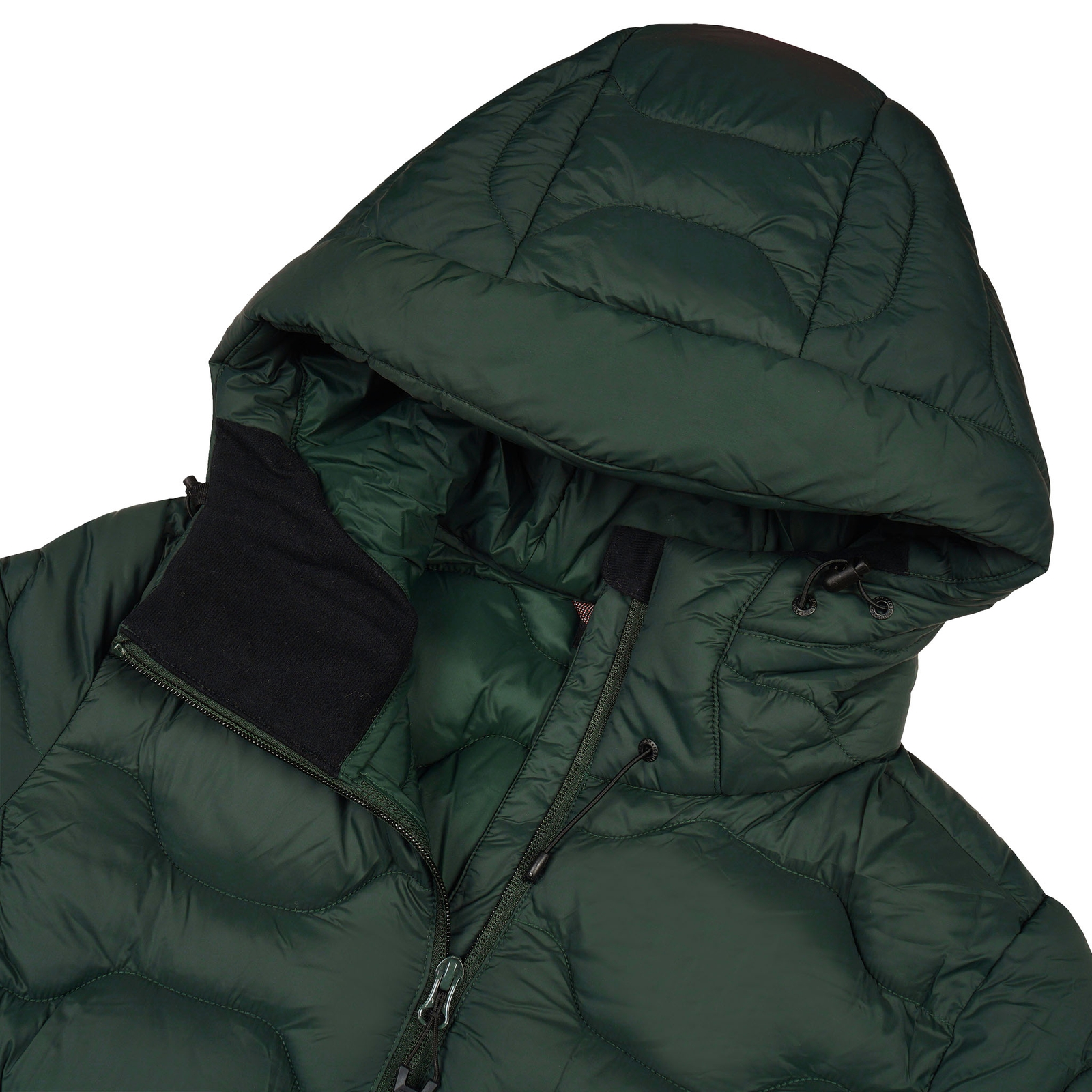 - Stehkragen, übergehend in verstellbare Kapuze