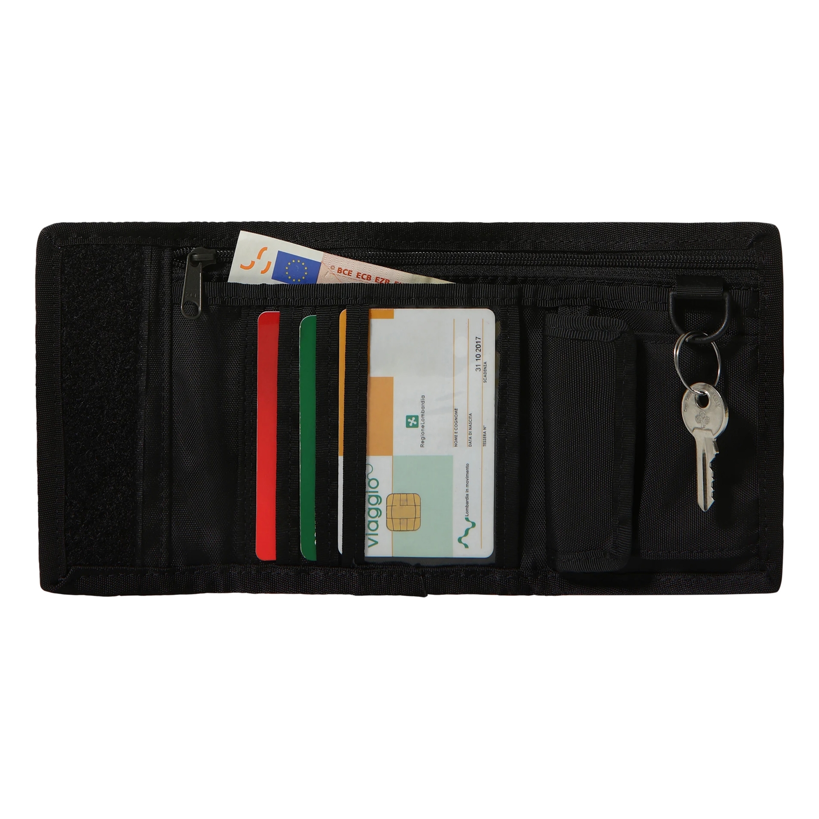 - ein Münzfach mit Klettverschluss, ein Geldscheinfach, ein Fach mit Reißverschluss